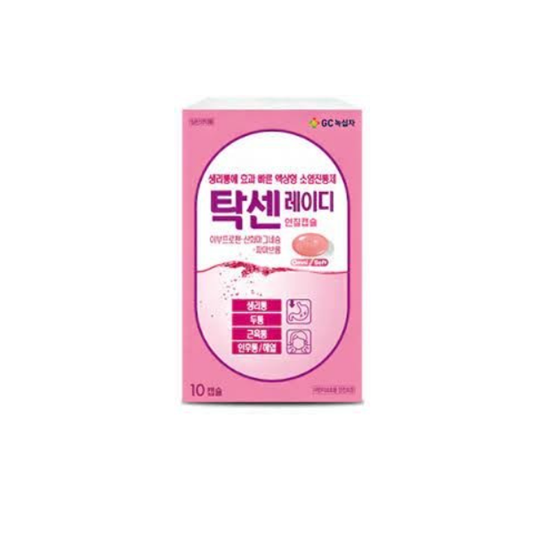 탁센 레이디는 일부분 밝은 회색의 유상내용물, 일부분 무색의 투명한 액을 함유한 분홍색의 장방형 연질캡슐이며, 월경전 증상인 통증과 붓기를 완화시켜주는 약입니다.